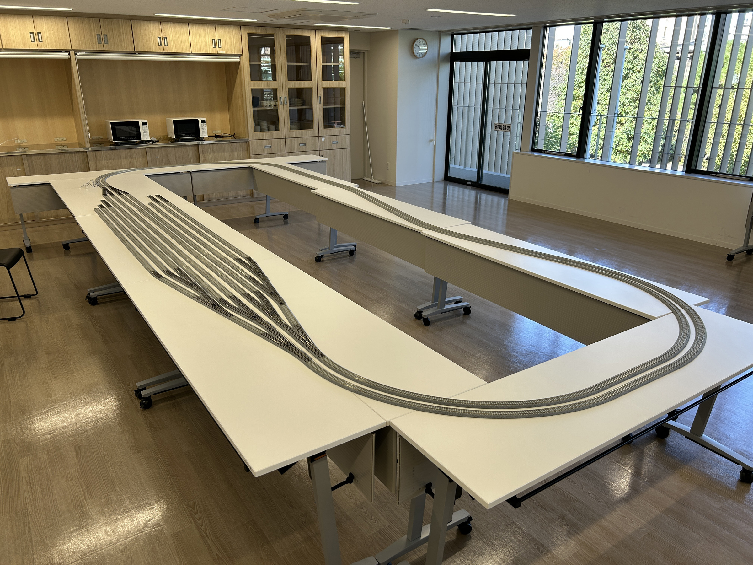 複線オーバルに組み線路のヤードです。前回まで使っていたベニヤ板のヤードは重いので使うのをやめました。砂利を敷き詰めてもう少しいい感じにしたいところです。